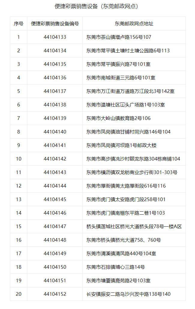 为进一步丰富福彩销售渠道类型,扩大福彩销售渠道规模,东莞福彩中心与东莞银行股份有限公司东莞分行(下简称“东莞银行”)及中国邮政集团有限公司东莞市分公司(下简称“东莞邮政”)合作,在符合条件的东莞银行网点及东莞邮政网点投放便捷彩票销售设备开展兼营福利彩票业务。