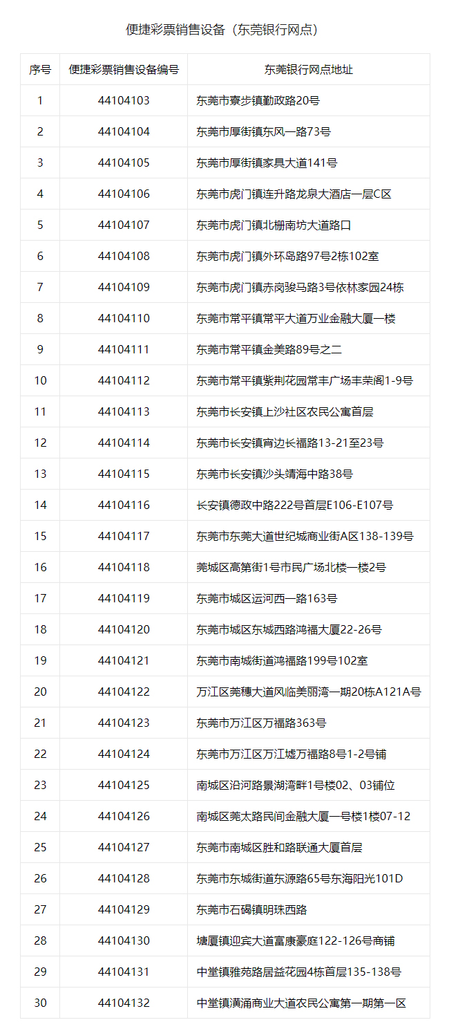 本次投放便捷销售设备的东莞银行网点及东莞邮政网点共有50个(其中东莞银行投放30个,东莞邮政投放20个),广大市民除了可以到传统的实体专营福彩销售场所购买彩票外,还可以前往兼营销售网点,通过便捷彩票销售设备体验“双色球”、“3D”、“南粤风采36选7”等游戏票种自主选号购彩的乐趣,并可以根据个人喜好和习惯选择复式、胆拖等不同的购彩方式,可谓随手公益,一起造福。