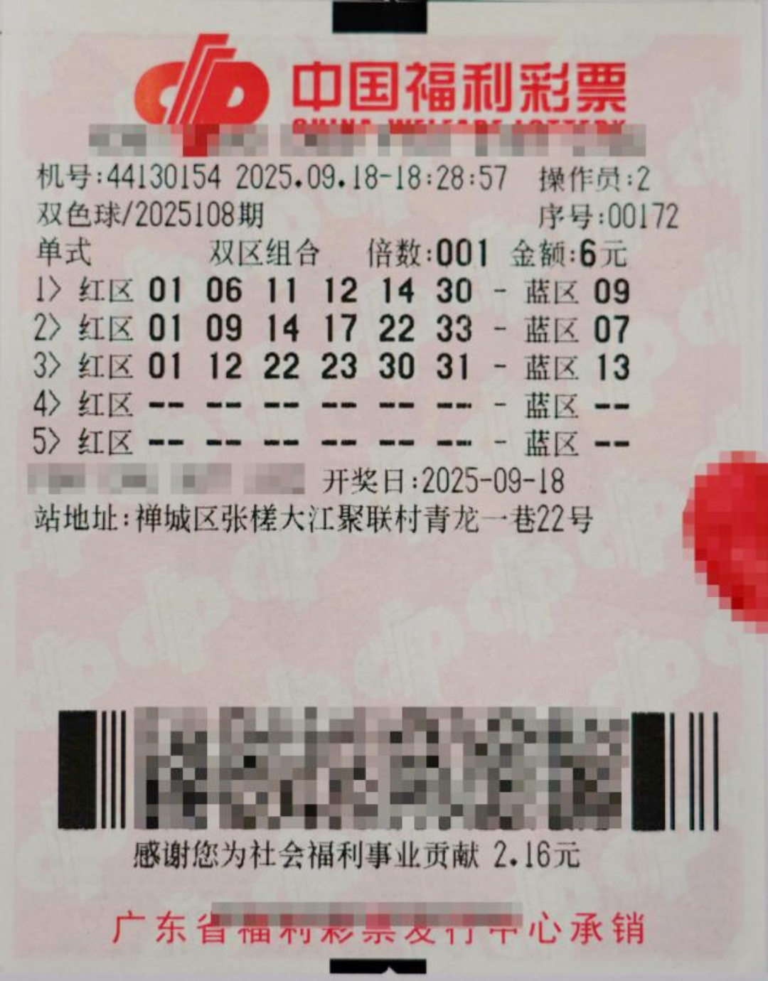 2025年9月18日,中国福利彩票双色球第2025108期开奖,当期全国共中出一等奖5注,其中1注花落佛山市禅城区44130154福彩销售站点。中奖彩票是一张1倍3注的单式彩票,中奖奖金830多万元。