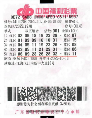 10月16日双色球游戏第2025119期开奖,当期全国共中出一等奖11注,其中1注花落广东江门市江海区江南新中大道13号铺的44120208福彩销售站点,中奖彩票是一张投注金额为10元的5注单式票,中奖奖金611多万元。