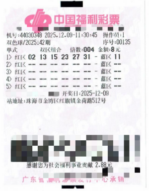 2025年12月9日,中国福利彩票双色球第2025142期开奖,当期全国共中出二等奖79注,其中4注花落珠海市44030348福彩销售站点,中奖彩票是一张投注金额为8元的4倍1注单式票,中奖总奖金126万元。