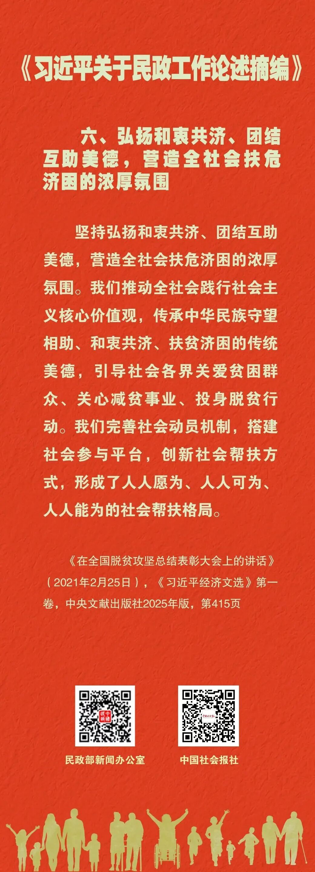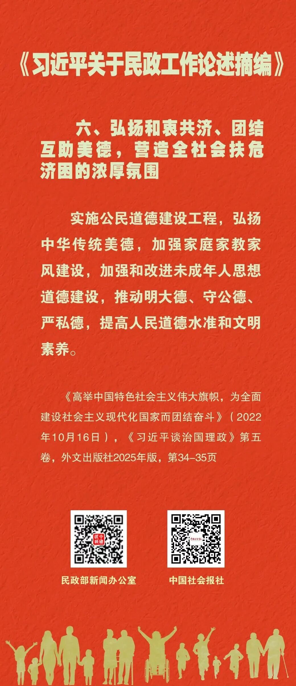 《习近平关于民政工作论述摘编》(以下简称《论述摘编》)已出版发行。《论述摘编》全面反映习近平总书记对新时代民政工作的深邃思考和重大部署,为深入学习领会习近平总书记重要论述提供了权威读本和最新教材。