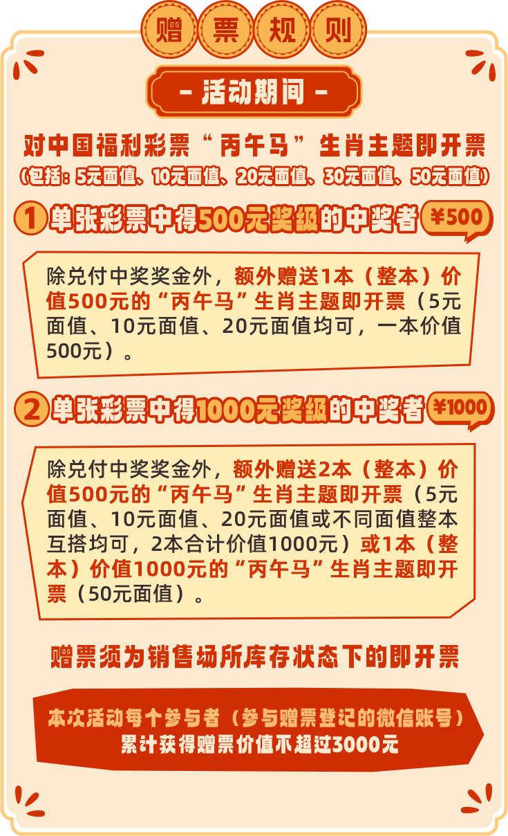 本次活动时间为2026年2月8日0时至4月26日22时,限在广东省(不含深圳)购买且在2026年2月8日0时后在广东省(不含深圳)兑奖的中国福利彩票“丙午马”生肖主题即开票(包括:5元面值、10元面值、20元面值、30元面值、50元面值)参加。如活动期间,赠票资金提前使用完毕,则活动结束。