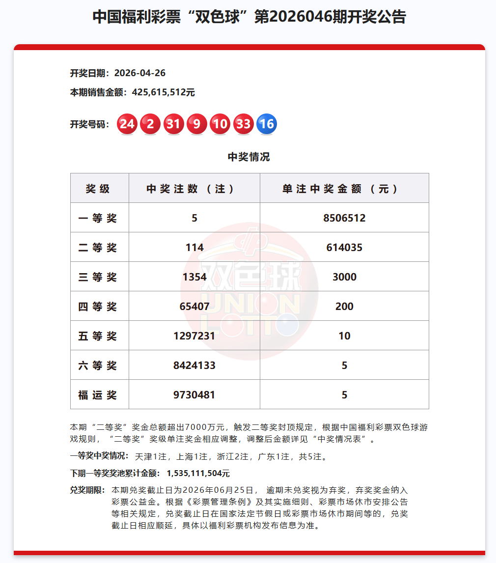 一等奖 天津(1注)上海(1注) 浙江(2注)广东(1注)