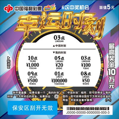 您的时刻就是“幸运时刻”!近日,中国福利彩票最新推出刮刮乐“幸运时刻”,票面以时钟及刻度数字为主,将时间刻度与幸运时刻有机结合,鎏金标题、螺旋特效将时间飞逝表达的淋漓尽致。本票每张面值5元,全套张数1张,最高奖金达10万元。