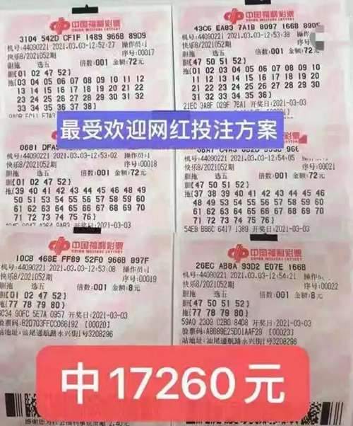 20个中奖号码剩下16个落在拖码区,76注里将会有16注中得5中5,而剩下60注则是5中4。中奖金额是16注5中5单注奖金1000元,60注5中4单注奖金21元,合计中奖17260元。