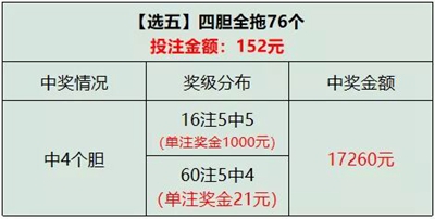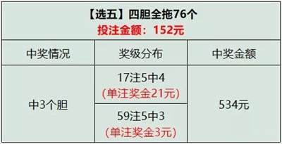 但是,选四单式76倍投注4中3时,收益是76倍×5元=380元,而选五四胆全拖玩法中3个胆时的收益是534元。