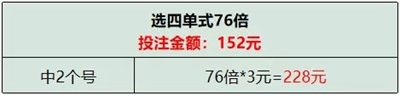 假设选四单式76倍投注,选4中2,单注奖金3元,76倍则是228元,这种情况下,选四单式76倍投注的收益是大于选五四胆全拖玩法中2胆时的收益的。