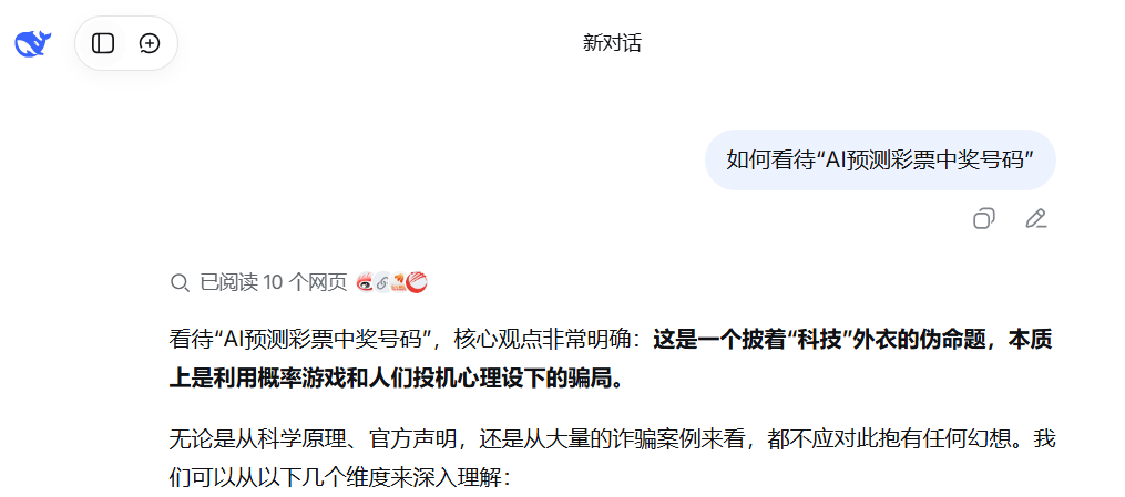 Deepseek:看待“AI预测彩票中奖号码”,核心观点非常明确:这是一个披着“科技”外衣的伪命题,本质上是利用概率游戏和人们投机心理设下的骗局。