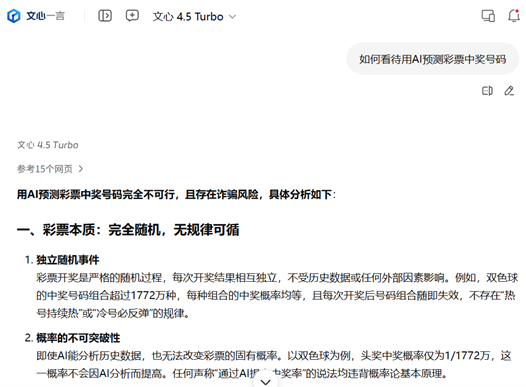 文心一言:用AI预测彩票中奖号码完全不可行,且存在诈骗风险。