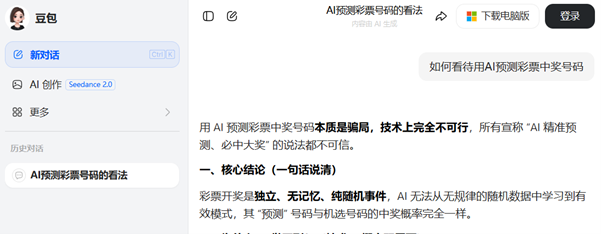 豆包:用AI预测彩票中奖号码本质是骗局,技术上完全不可行,所有宣称“AI精准预测、必中大奖”的说法都不可信。