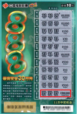 李先生分享了自己的中奖经过:3月27日晚,他下班路过44120155福彩销售站点,进店时看到展示柜有一张“888”刮刮乐即开票的尾票,便买了下来开刮。在刮开彩票的玩法区后,出现三个相同的号码“39”,中奖了!对应的奖金是30万元!